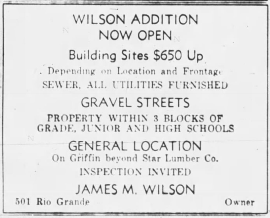 THE WILSON ADDITION is a subdivision added to Santa Fe in 1946. It’s bounded on the west by Arroyo del Rosario; on the east by Chamisa Street (renamed Rio Grande Place by the City Council in 1962); and on the south by Griffin Street.