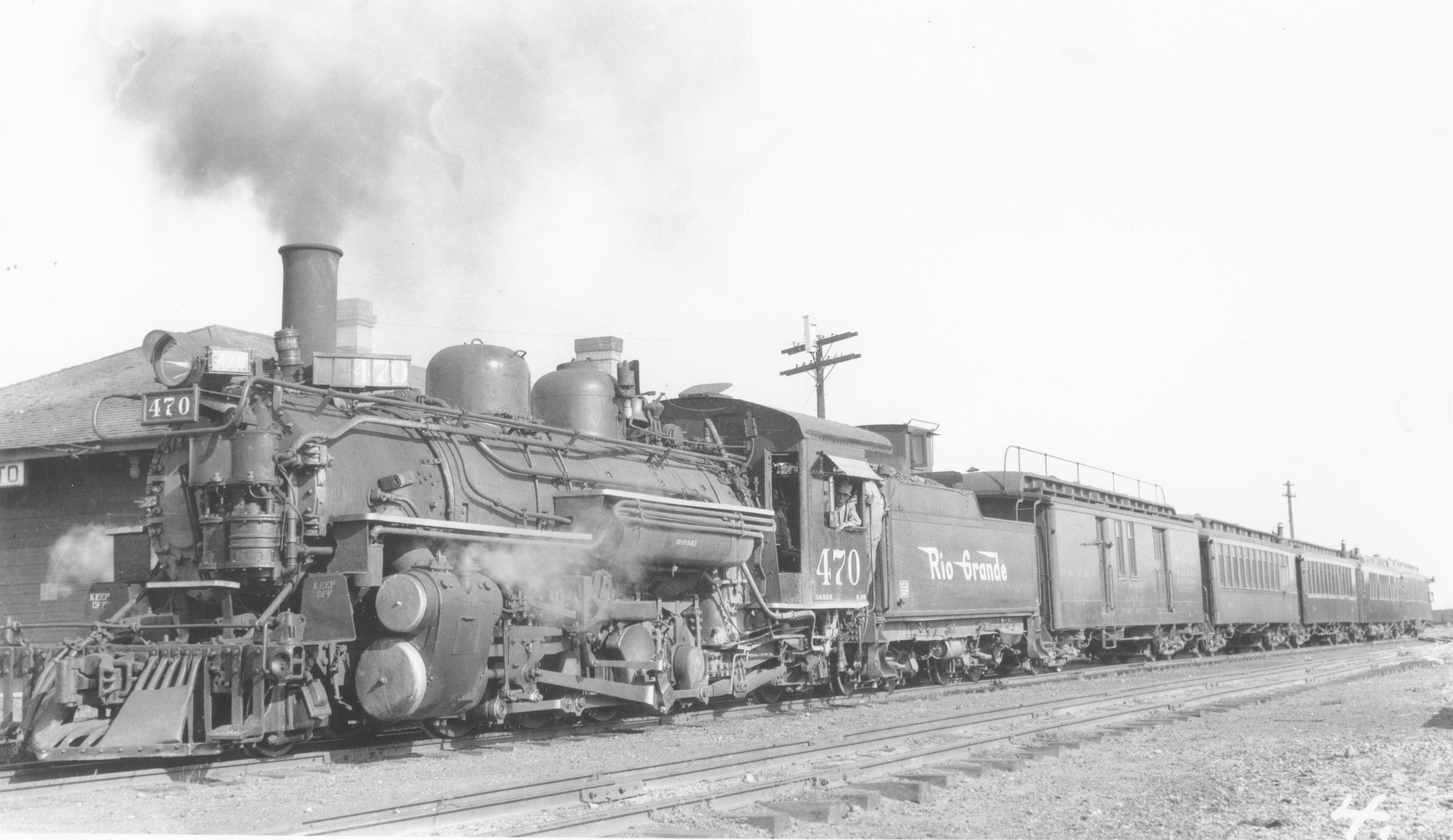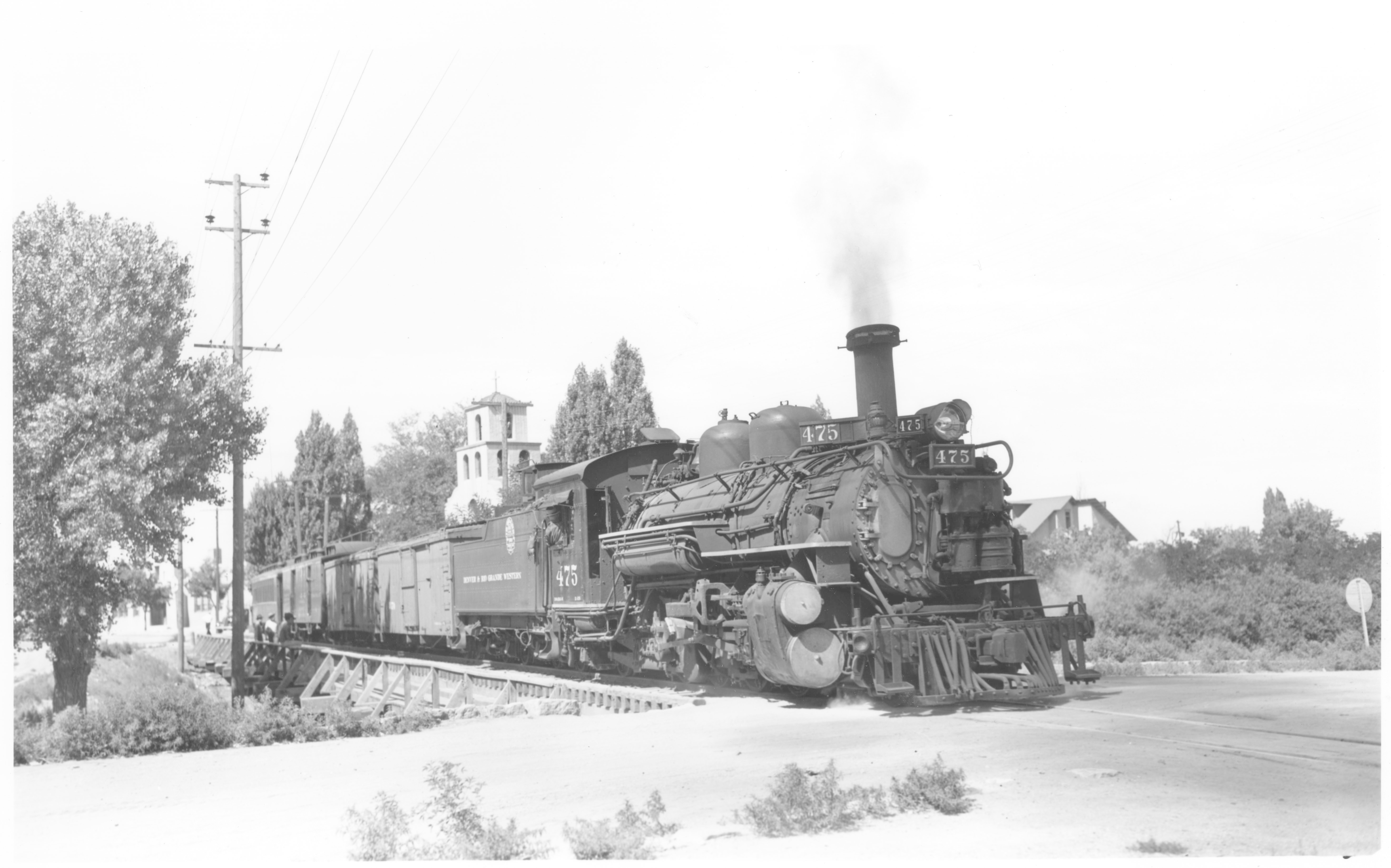 Trains like this one made this trip six days a week for more than half a century. While one train traveled from Santa Fe to Antonito, a second train traveled in the opposite direction on the same track. To pass each other, they used a siding in the middle of the route. The crews spent the night in the destination cities and made the reverse trips the next day. People called this railroad the Chili Line because it sometimes carried chilies, but its real name, in its final years, was the Santa Fe Branch of the Denver & Rio Grande Western (D&RGW).