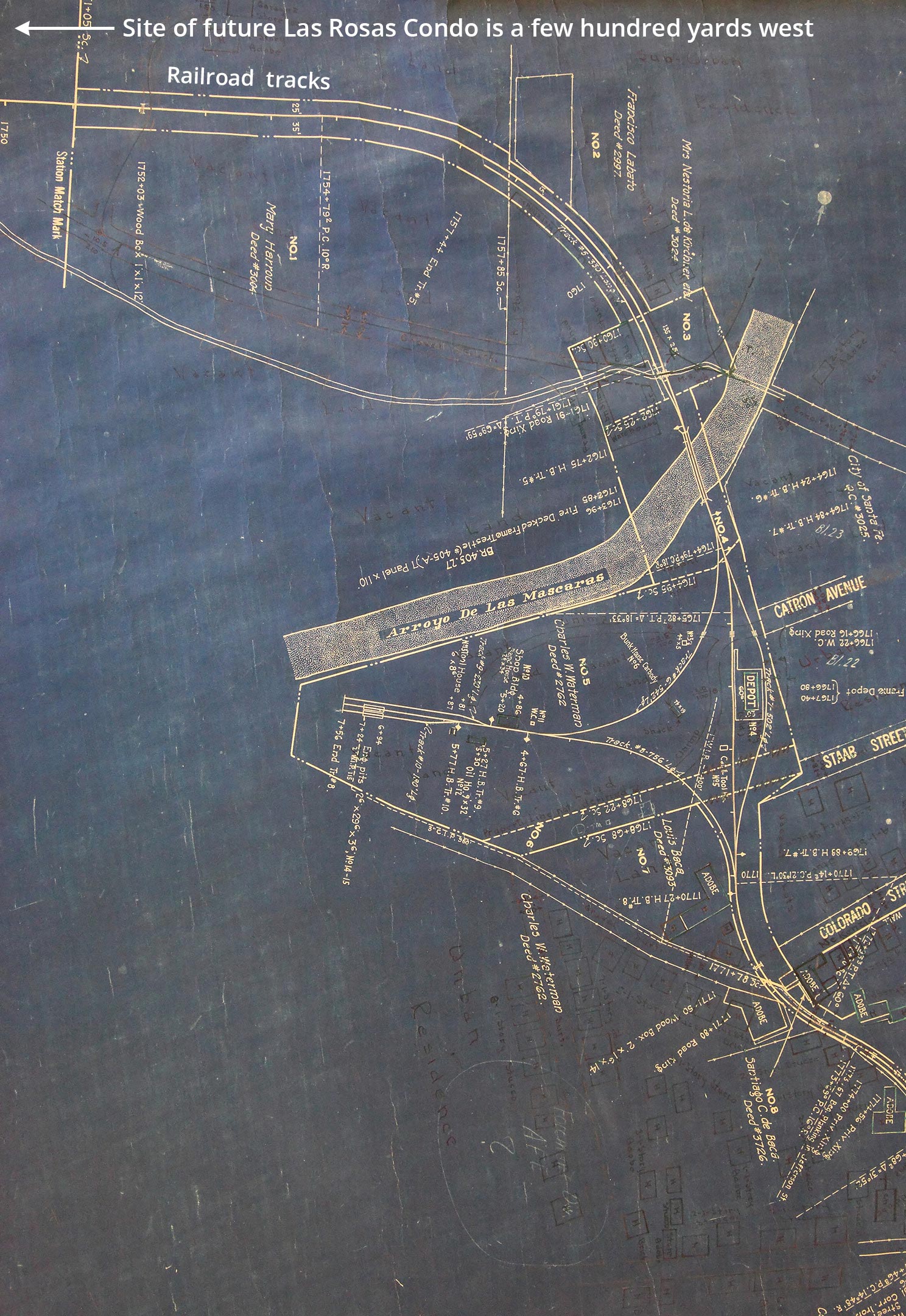 After crossing the arroyo, the train heads west on Rio Grande Avenue and passes within 20 or 30 feet of the property line of our condominium. I’m taking liberties with language because the train is doing this in 1940 and Rio Grande Avenue and our condominium haven’t been built yet.